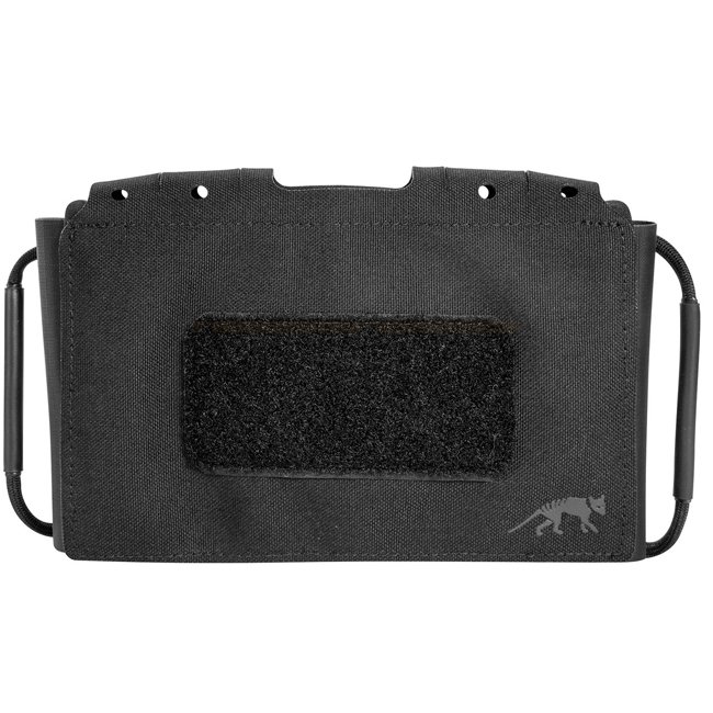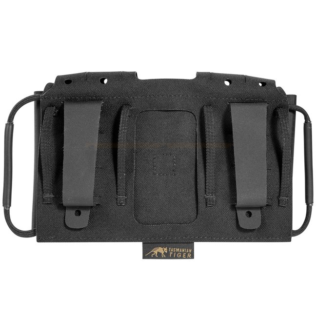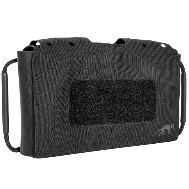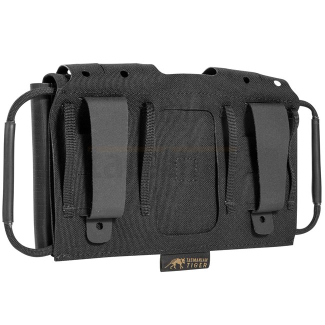 Compact Tasmanian Tiger IFAK Pouch Dual in black, perfect for MOLLE surfaces or belts. Features fold-out first aid panel, adjustable fixation for medical gear, hook-and-loop fastening, back hook-and-loop strips, and more. Made of durable laminated CORDURA