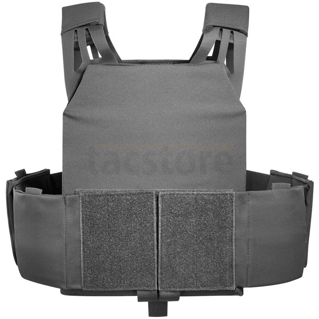 Lightweight, flat plate carrier with neutral front, designed for undercover use. Features adjustable elastic side attachment, removable side pockets, and is suitable for SAPI plates. Size L fits plates up to 33 x 26cm. T-Square Rip FD material, weighs 410
