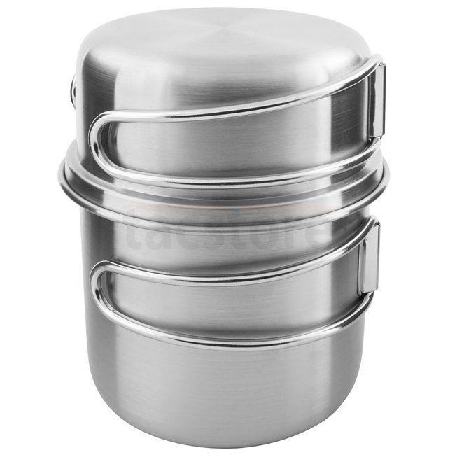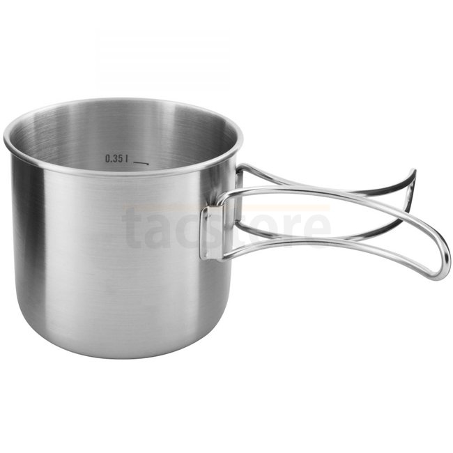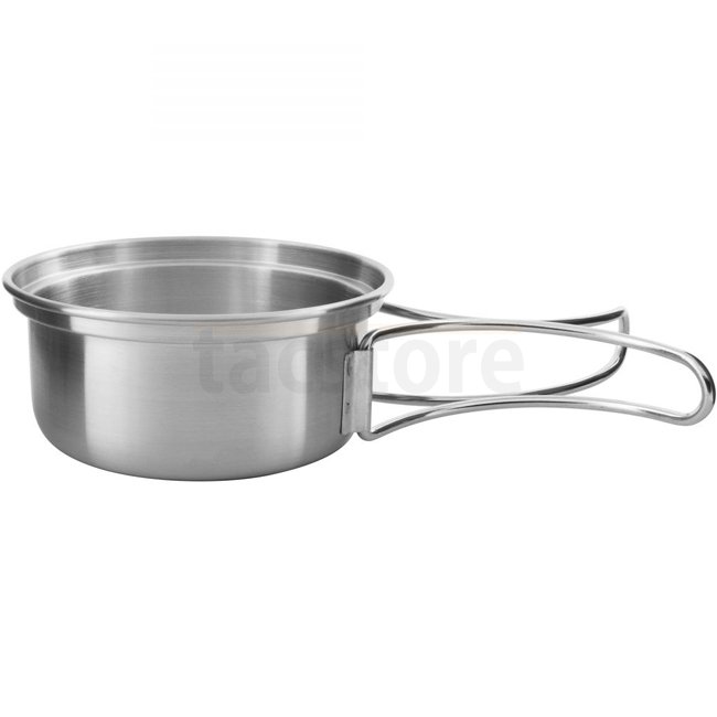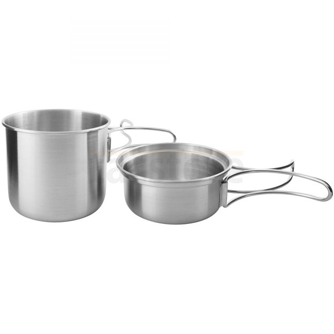 The small stainless steel set is a clever minimum equipment for trekking. The stainless steel mug and the 4 cm deep stainless steel lid have folding handles. The lid can also be used as a pan or bowl.