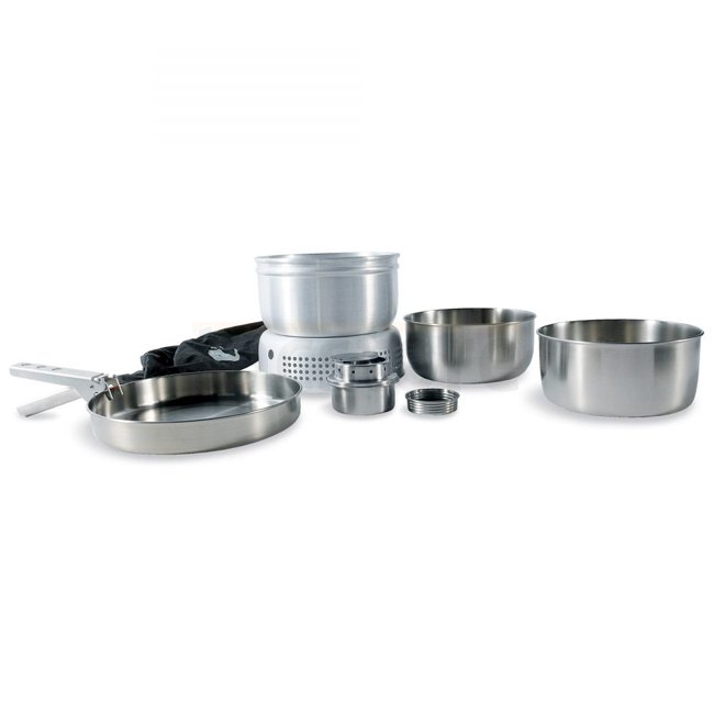The camping tableware is made of 18/8 stainless steel and consists of a pan, two pots, pot gripper, cooking rack and spirit burner. Burning time about 40 minutes per filling.