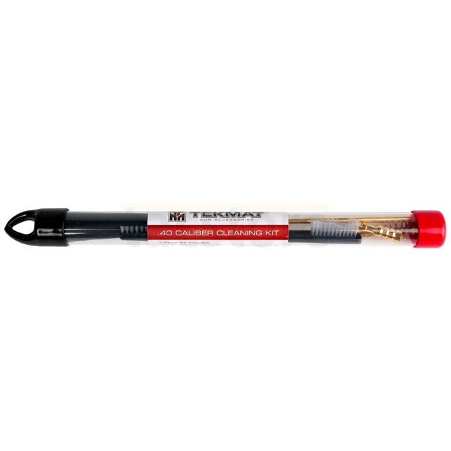 This TekMat .40cal Handgun Cleaning Kit includes all the essential tools for maintaining your firearm, such as brass brushes, jags, cleaning patches, nylon brushes, a brass rod with handle, a plastic bore guide, a carry tube, and a nylon bag.