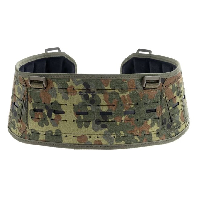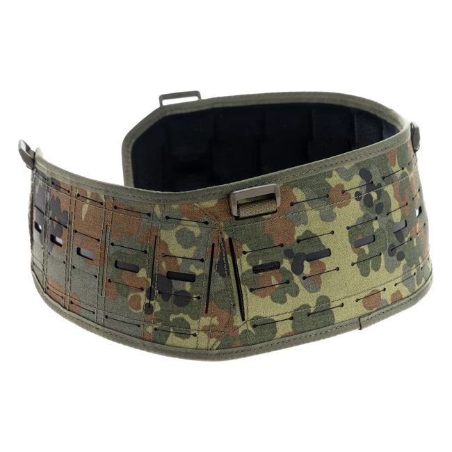 The PT4 GENIII L is a low-profile battle belt designed to be used in conjunction with any rigger or duty belt not wider than 50 mm. The outer surface is made of durable laminate and is MOLLE-compatible, providing modularity for attaching additional pouches and gear. The belt includes a comfort pad with velour fabric, enhancing user comfort and stability.