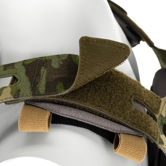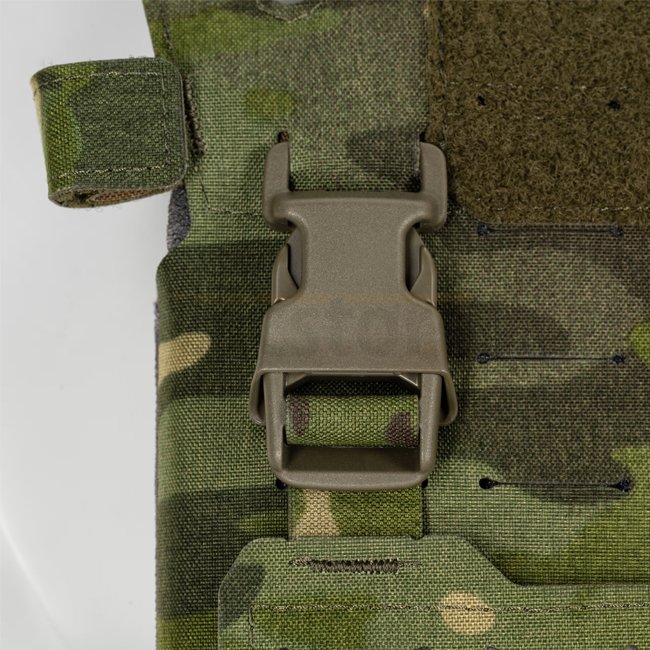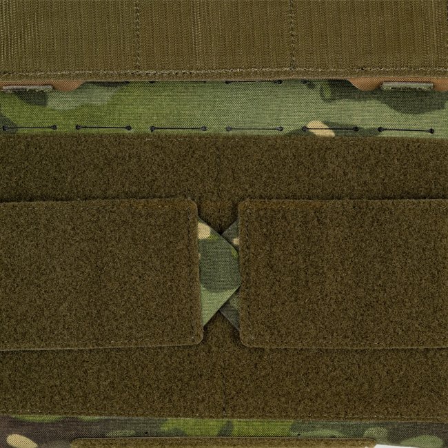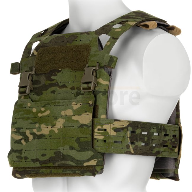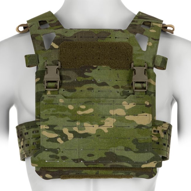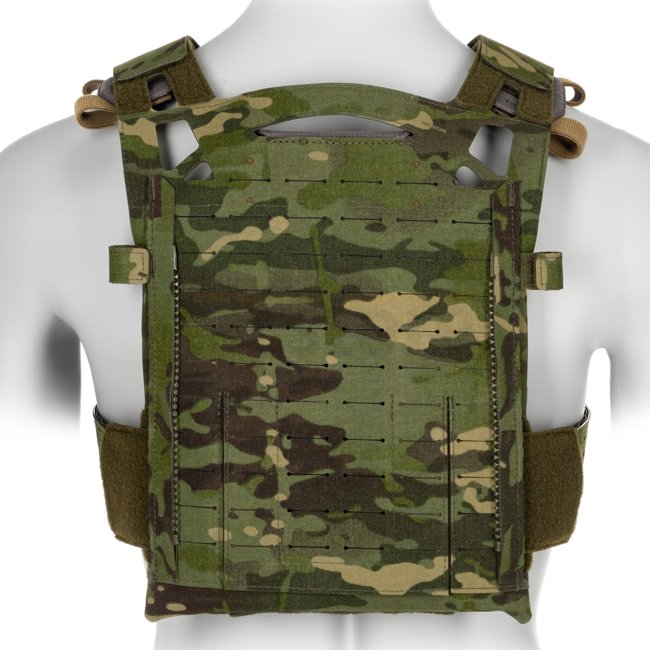 The plate carrier features padded shoulder straps for enhanced comfort and adjustable fit. Laser-cut technology significantly reduces weight without compromising functionality.