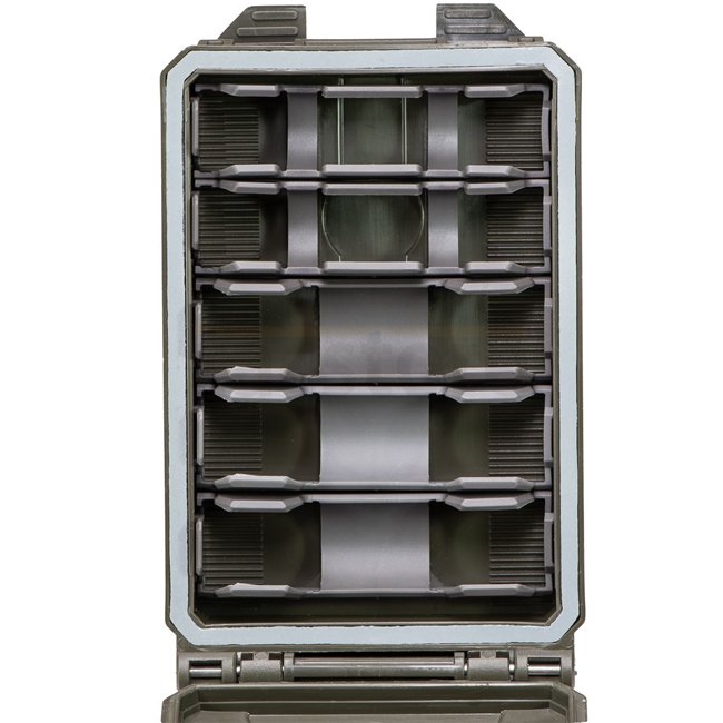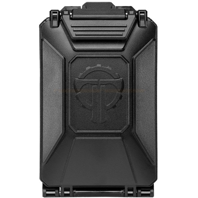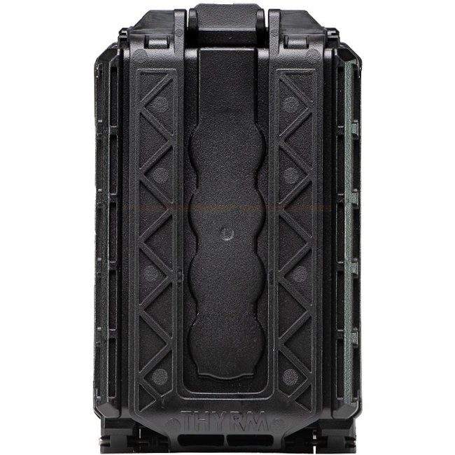 THYRM CellVault-5M offers modular storage for various battery sizes, featuring waterproof seal, secure latch, and MOLLE attachment straps. Durable polymer construction. Dimensions: 16.5 x 91.4 x 5.0 cm. Weight: 200g.