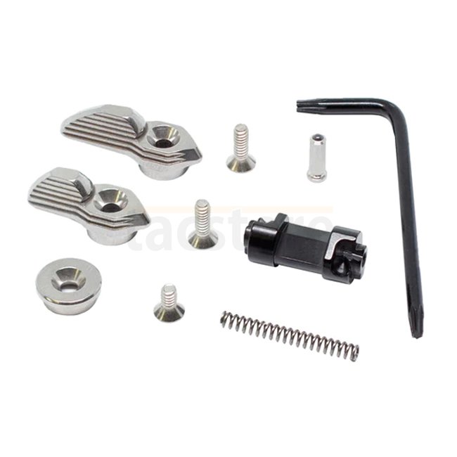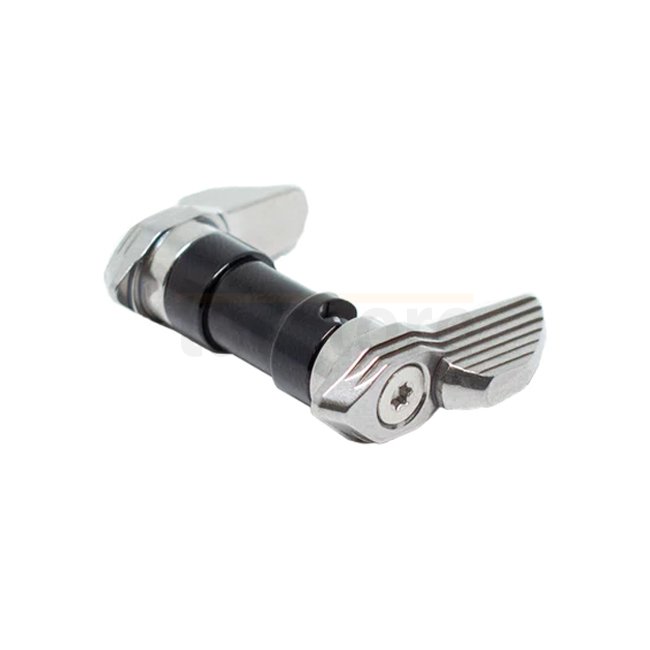 The AR Safety was developed to maximize the performance with TriggerTechs AR triggers and loaded with features. The patented design allows the safety to be installed and removed without removing the grip (after initial install). This is made possible by the tumbler and ball tipped detent pin. This feature saves time when changing triggers, cleaning or performing maintenance on your firearm. The detent has a silicon nitride ball tip which offers extremely low friction and durability, which gives an unmatched smooth feel when changing from safe to fire. The same material used on the bottom of space shuttles! The safety is ambidextrous with interchangeable short and long levers. A cap is provided to install on one side if the user wishes to only have a lever on one side. It can easily be setup as a 45 or 90 degree throw. The tumbler is made of 440C stainless steel and DLC coated for ultra performance and durability. The levers are constructed from 17-4 stainless steel and the black version is coated with PVD. This product is a must have for any competitive shooter looking to up their game!