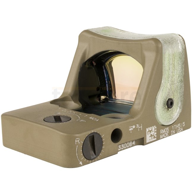 Designed for durability and speed, the Trijicon RMR RM05G features a amber 9.0 MOA dot illuminated by fiber optics in daylight and tritium in low light. Its forged aluminum housing with patented shape helps deflect impact forces, making it exceptionally rugged while weighing only 34 g. With tool-less windage and elevation adjustments, the RMR RM05G provides a compact and reliable aiming solution for pistols, carbines and shotguns.