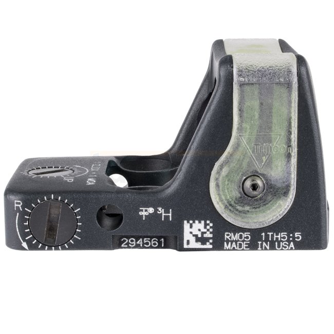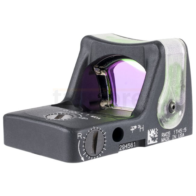 Designed for durability and speed, the Trijicon RMR RM05G features a green 9.0 MOA dot illuminated by fiber optics in daylight and tritium in low light. Its forged aluminum housing with patented shape helps deflect impact forces, making it exceptionally rugged while weighing only 34 g. With tool-less windage and elevation adjustments, the RMR RM05G provides a compact and reliable aiming solution for pistols, carbines and shotguns.