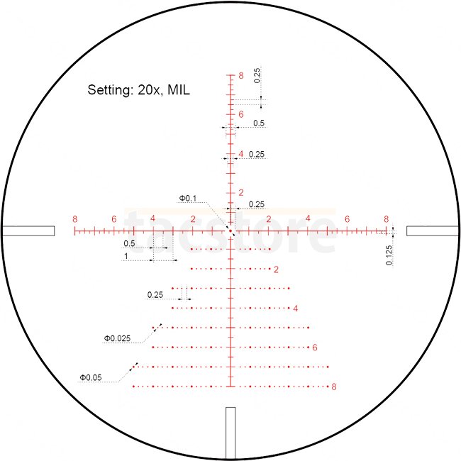 - SFP VCT-20A MIL reticle with illuminated center dot and Christmas-tree layout