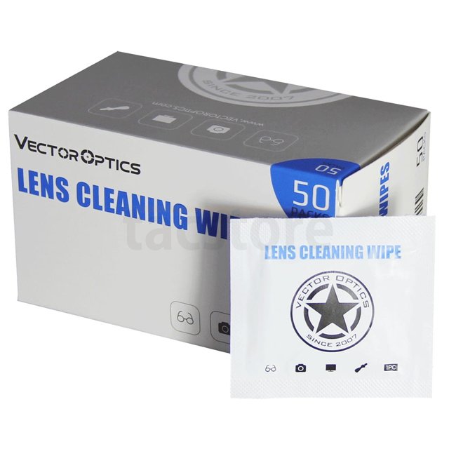 Vector Optics Lens Cleaning Wipes - 50 pcs. Pre-moistened, alcohol-free wipes with no water trace. Multi-purpose and ideal for lens cleaning. Comes in a master pack with individual packaging.