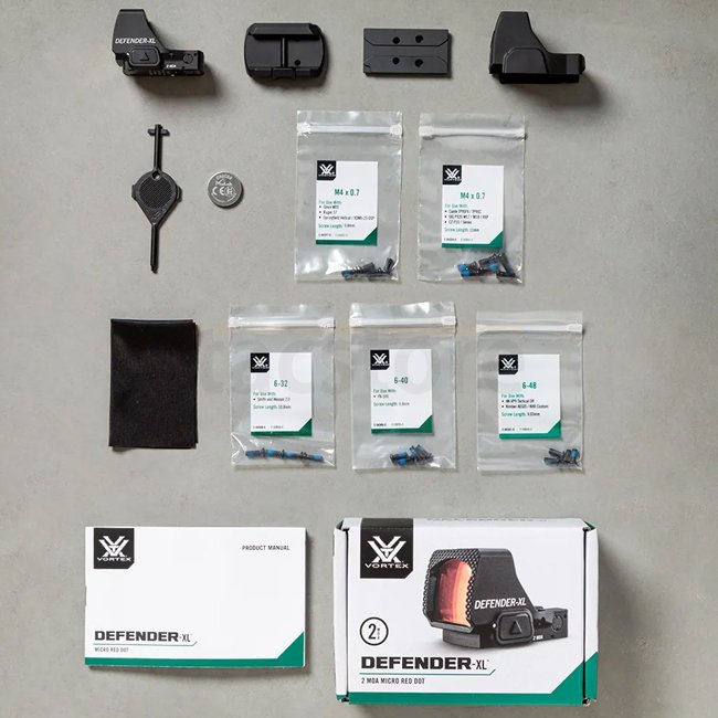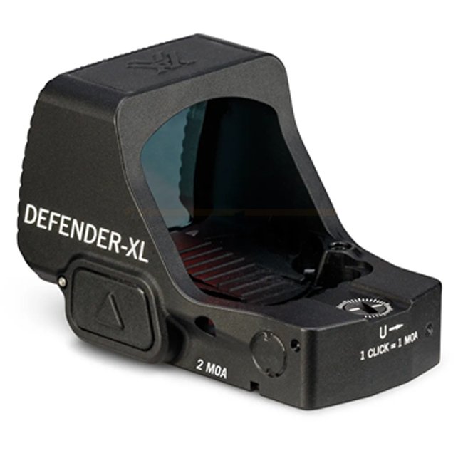 The Vortex Defender‑XL Red Dot 2 MOA delivers outstanding accuracy and fast target acquisition thanks to its fine 2 MOA dot and large aspheric lens (25.5 mm × 23.3 mm), providing a wide peripheral view with minimal distortion.