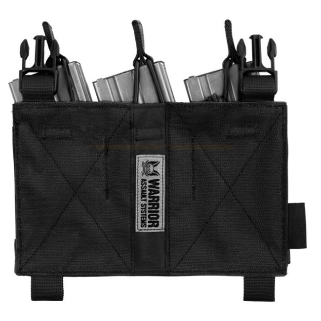 Detachable MOLLE front panel for attaching three magazines securely to Warrior's Recon Carrier (RPC). Features bungee retention cords and MOLLE webbing for versatile customization options.