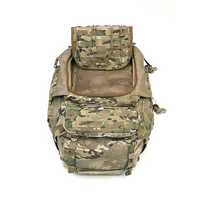 Access is via a helmet friendly top opening lid with claymore style heavy duty zipped pouch on top side, also features map style pocket on the inside. Additional access is via the large reinforced center pocket, this features a heavy duty size 10 sealed seam zip which opens into a medium sized quick access pocket (the flap opens top to bottom), this main external pocket is lined with a heavy duty air mesh fabric which has a similar zip which opens (bottom to top) allowing convenient access to the middle and bottom of the pack.