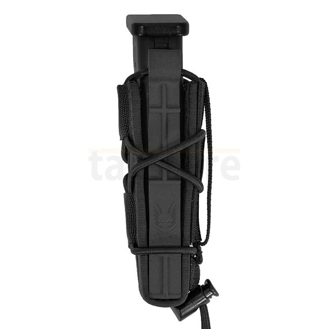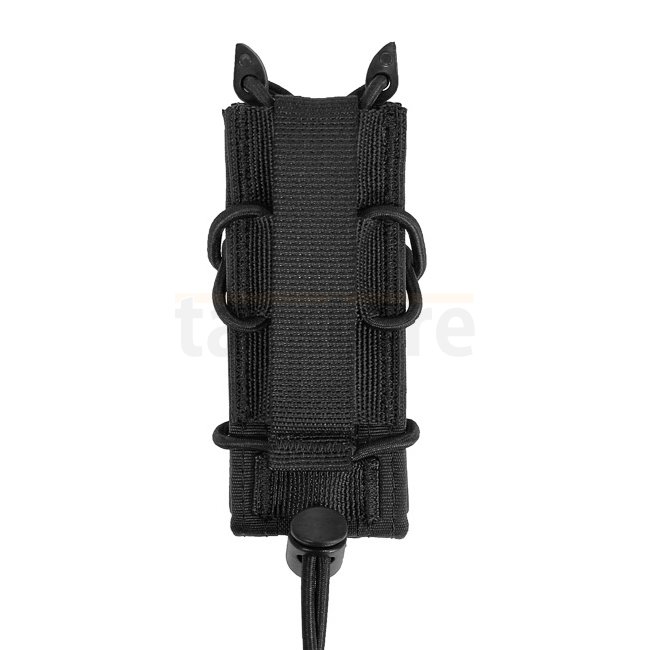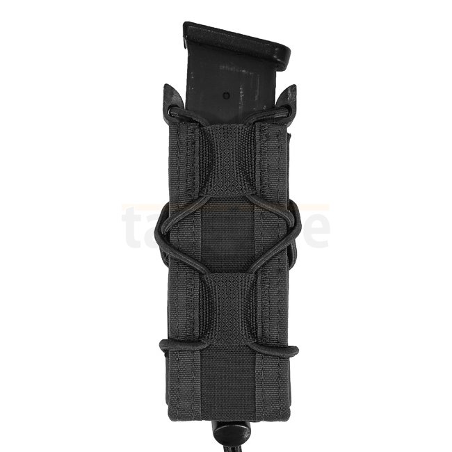 The Warrior Single Quick Mag Pouch is a versatile, multi-purpose pouch designed to hold a variety of 9mm pistol magazines. Size adjustment is made using elastic shock cords threaded through the sides of the pouch, ensuring a secure fit for the magazine.