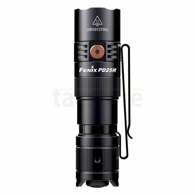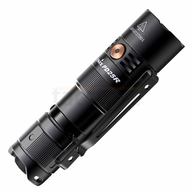 Die Fenix PD25R liefert bis zu 800 Lumen mit einer Reichweite von bis zu 250 m. Sie wird mit einem mitgelieferten 16340 Li‑Ion Akku betrieben und lässt sich alternativ mit einer CR123A Batterie verwenden. Die Ladung erfolgt über einen versteckten USB‑C Port. Mit Heck‑ und Seitenschalter lassen sich momentanes und Dauerlicht sowie sechs Modi steuern. Die Lampe ist staub‑ und wasserdicht nach IP68.