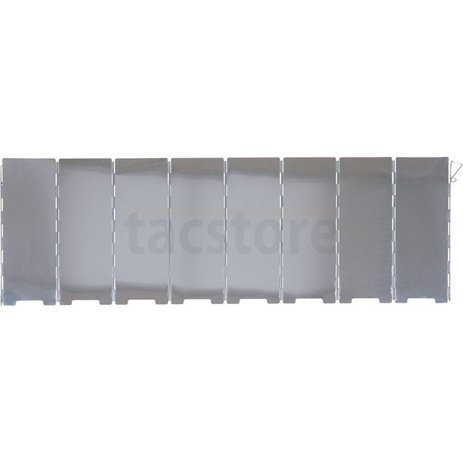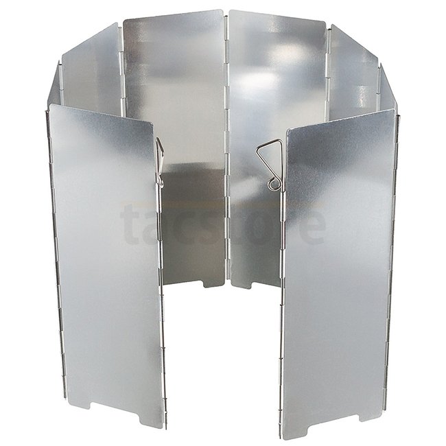 Windschutz für Outdoorkocher, auch als Spritzschutz. Mit 2 Erdhaltern, einschließlich Transporttasche. Hergestellt aus 100 % Aluminium. Leicht und faltbares Design.