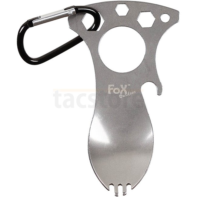 FoxOutdoor Multifunktionale Spork & Karabiner aus Edelstahl - Silber: Spork, Flaschenöffner, Schraubendreher, Schraubenschlüssel (10mm, 8mm, 6mm). Abmessungen: 10x5cm, Gewicht: 35g, Material: Edelstahl.