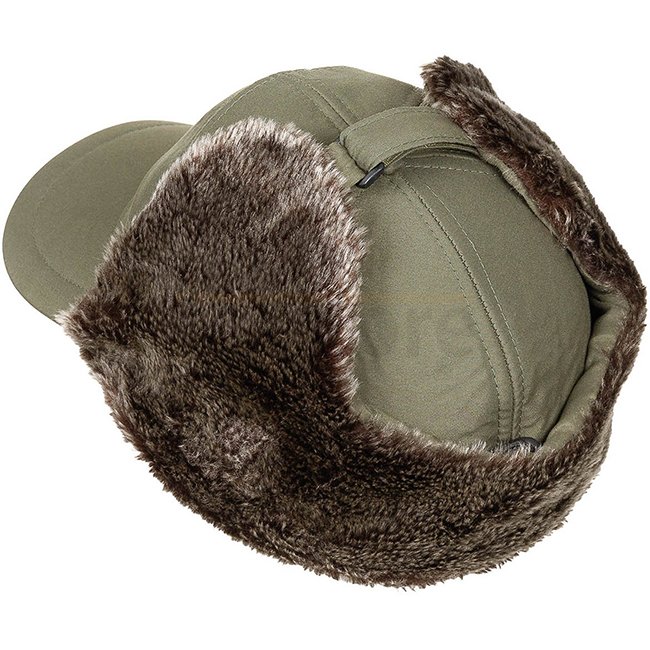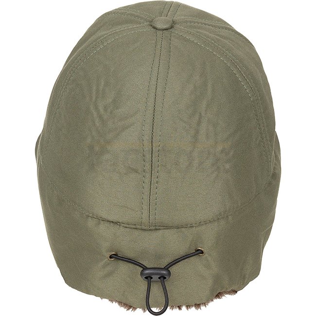 FoxOutdoor Trapper Wintermütze in Olive mit Ohrenklappen, Schirm und Kunstpelzdetails. Verstellbarer Kordelzug mit Stopper hinten und Fleecefutter. Hergestellt aus 100% Polyester.