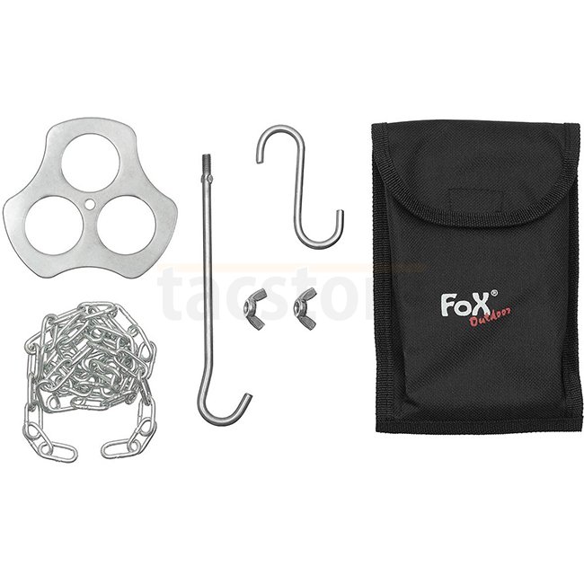 FoxOutdoor Stativhalter, robust und vielseitig für die schnelle Einrichtung jeder Kamera oder jedes Geräts mit einem maximalen Durchmesser von 3,5 cm. Enthält Kette, Schraubhaken, S-Haken, Transporttasche, Platte und verschiedene Stahlzubehörteile. Einfac