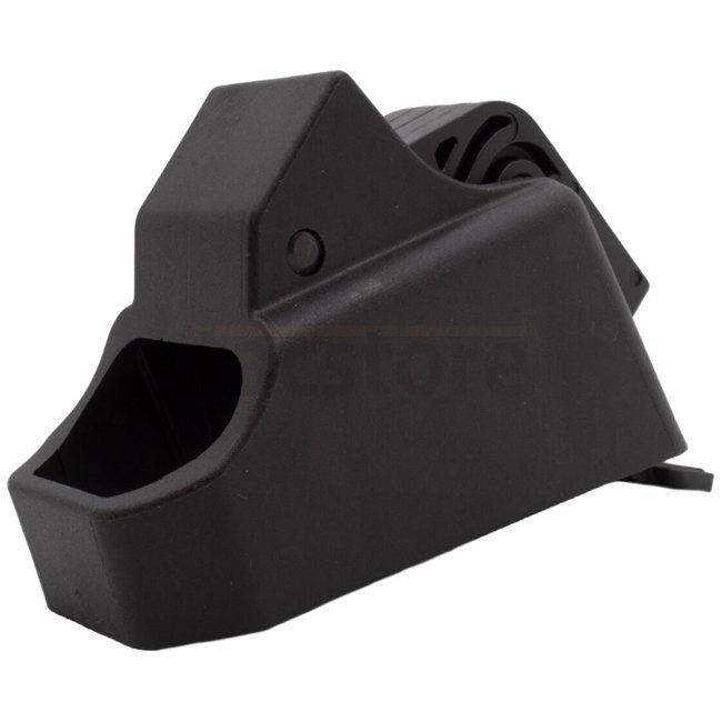 Mode d'emploi: Placez simplement le chargeur sur le magazine, insérez les cartouches dans l'emplacement prévu et appuyez dessus avec le levier. Répétez l'opération jusqu'à ce que le chargeur soit entièrement rempli.
