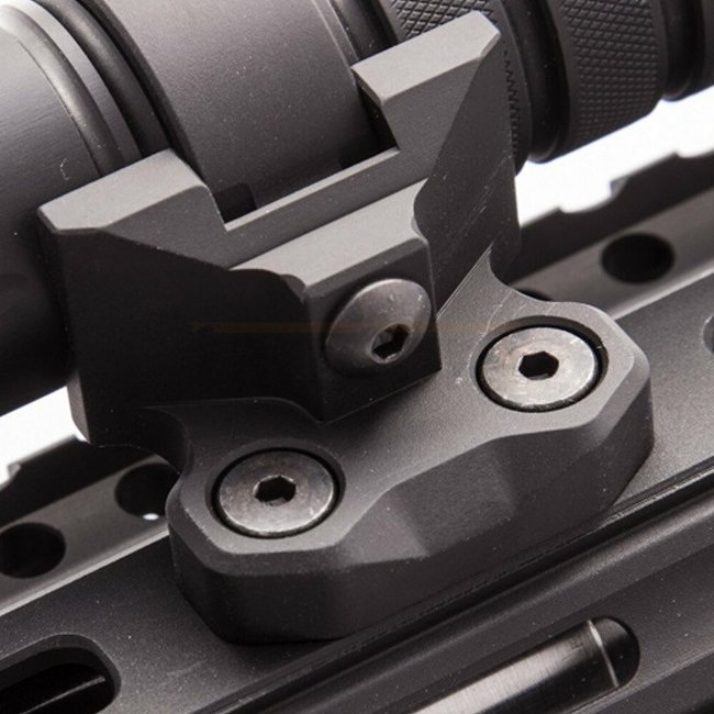 Le placement décalé de la lumière lors de l'utilisation du support est conçu pour permettre un dégagement avec la plupart des guidons. Par exemple, une lumière de 1.03 pouces comme la Surefire G2 fonctionnera avec le Magpul Gen 2 MBUS sur un Noveske NSR, qui est l'un des protège-mains les plus fins avec une largeur de 1.48 pouces.