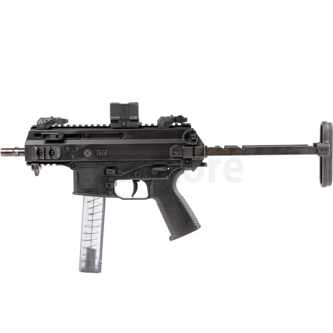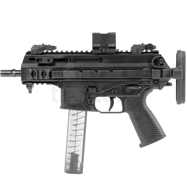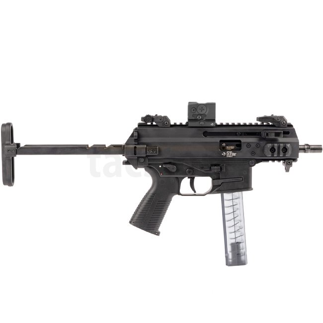 La B&T APC9 K PRO est une carabine semi-automatique compacte chambrée en 9x19mm. Conçue pour les opérations tactiques, elle dispose d'une crosse télescopique, de commandes ambidextres et d’un raccord de silencieux à 3 tenons. Elle est compatible avec les chargeurs APC9 / MP9 / TP9 et est équipée d’un viseur point rouge Aimpoint® ACRO P-1 pour un ciblage précis.