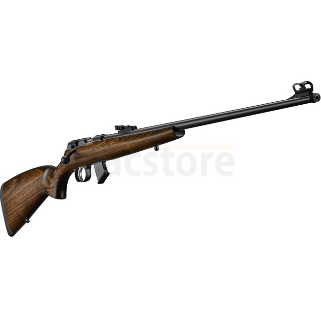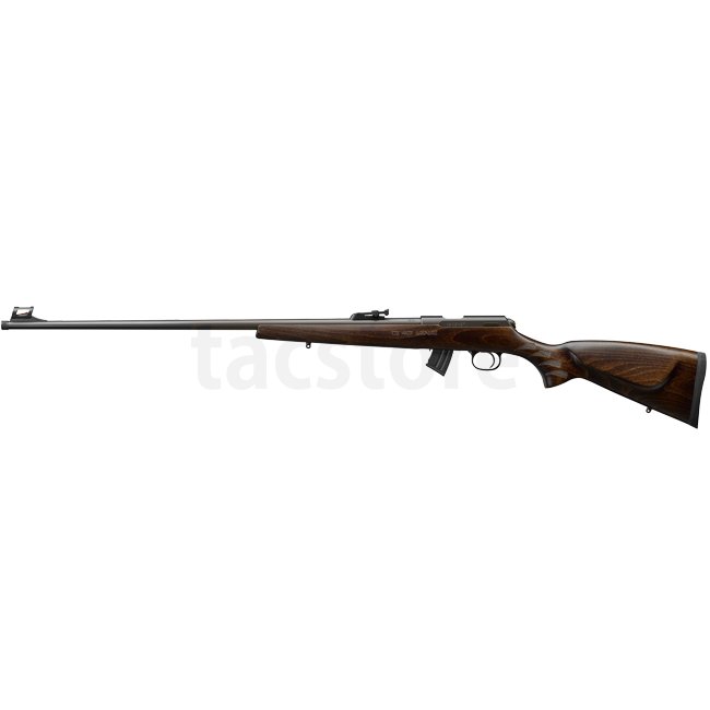 La CZ 457 Jaguar XII est une carabine moderne à percussion annulaire dotée du plus long canon de la série CZ 457, mesurant 726 mm. Elle est équipée d'une hausse tangentielle réglable de 25 à 200 mètres. La crosse en bois de hêtre présente un motif distinctif de jaguar, avec des marques de griffes remplaçant le quadrillage traditionnel pour une meilleure prise en main. Un chargeur métallique durable de 10 coups est inclus en standard.