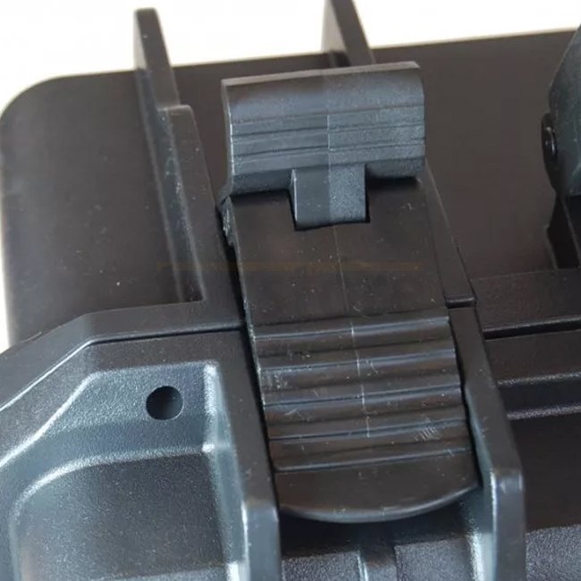 • Conception solide: joint étanche, soupape automatique d’égalisation, quatre loquets à double ouverture, poignée soft-grip testée, passages pour cadenas, charnières sur toute la longueur, points de fixation supplémentaires, système empilable, coque épaisse avec logo DAA en résine