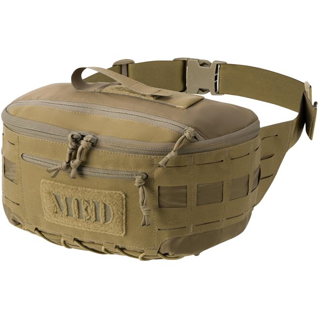Le sac ceinture Lysander MED offre un moyen compact de transporter le matériel médical essentiel à utiliser. Grâce à sa forme ergonomique, il se place sous le porte-plaque, ce qui est particulièrement utile lors d'interventions dans des espaces restreints. Une poche zippée sur le devant permet de ranger des gants de protection, tandis qu'un patch médical peut être fixé à l'aide de Velcro à l'extérieur. Le compartiment principal se ferme avec une fermeture éclair bidirectionnelle et sa doublure douce en Velcro peut être facilement configurée pour chaque équipement à l'aide des bandes spéciales incluses. Un autre compartiment au dos du sac accueille de grands bandages plats et se ferme grâce à une petite fermeture velcro. Il y a deux poches supplémentaires cousues sur le rabat de fermeture, une pour les ciseaux et l'autre pour les cartes d'accident TCCC. Un système compatible MOLLE/PALS découpé au laser est fixé sur les côtés du sac auquel peuvent être fixés des sacs supplémentaires pour bandages, garrots, etc. Le système compatible MOLLE/PALS continue jusqu'au fond du sac pour attacher des équipements supplémentaires tels qu'un COMBAT STRETCHER. En plus d'utiliser le système compatible MOLLE/PALS sur le fond, nous y avons attaché un cordon de serrage tissé pour des options de fixation supplémentaires.