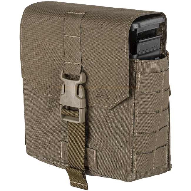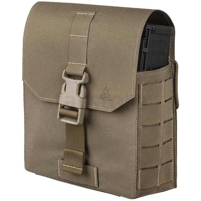 Pochette dédiée pour boîtes de ceinture pour mitrailleuses basées sur la M249, adaptée pour des boîtes de ceinture de mitrailleuse légère 5.56mm ou 7.62mm. Comporte un transport sécurisé avec un rabat droit fermé par une boucle et un accès facile. Peut êt