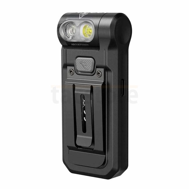 La Fenix SW05R‑UV associe une LED blanche à une LED UV (365 nm). Elle est équipée d’un clip pour fixation sur vêtement ou bordure, et d’une tête inclinable à ~200° pour orienter le faisceau. La batterie est intégrée et rechargeable via USB‑C.