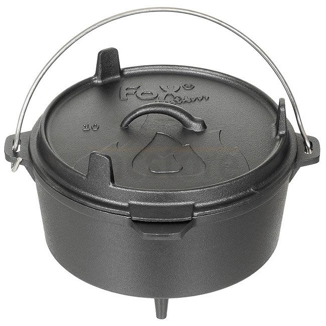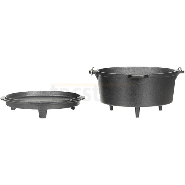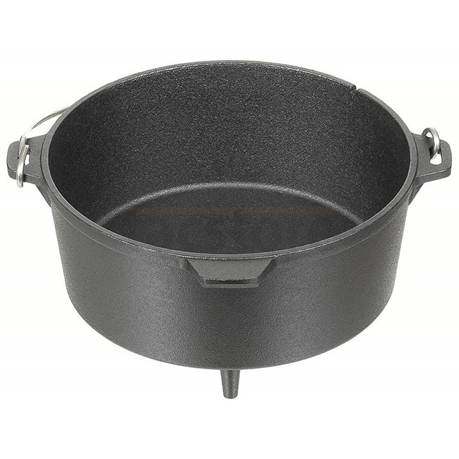 cocotte et couvercle avec 3 pieds anse pliable couvercle avec poignée, utilisable comme poêle petite encoche laterale pour thermomètre Capacité: ca. 3,8 l (4 Qt) Dimensions: ca. 30 x 13,5 cm (D x H) Hauteur avec couvercle: ca. 18,5 cm Poids avec couvercle: ca. 5,6 kg