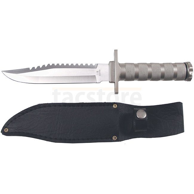 Couteau de survie FoxOutdoor - Argent : Lame à tranchant lisse et dos de sciage, poignée creuse avec capuchon à vis étanche, mini boussole, kit de survie, étui en cuir synthétique.