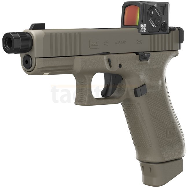La Glock 45 MOS Hunter Edition est un pistolet crossover 9mm Luger qui combine la carcasse pleine taille de la Glock 17 avec la glissière compacte de la Glock 19. Cette édition spéciale est équipée d'une optique COA, d'une lampe tactique GTL II, d'une finition vert olive, d'un canon fileté et d'une plaque de fond prolongée. La configuration Modular Optic System (MOS) permet un montage facile des viseurs optiques sans nécessiter une nouvelle glissière ou un système de montage séparé.