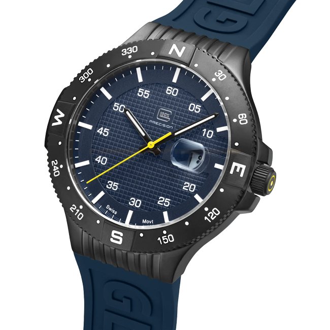 Enfermé dans un boîtier en acier inoxydable sablé avec une finition gunmetal, le cadran bleu affiche des aiguilles et des indices avec Swiss Super-LumiNova® ainsi qu’une aiguille des secondes jaune remarquable. Un bracelet en silicone bleu avec le logo GLOCK entoure le poignet, offrant un look sportif. Alimentée par un mouvement suisse et résistante à l’eau jusqu’à 20 ATM, cette montre incarne durabilité et résilience.