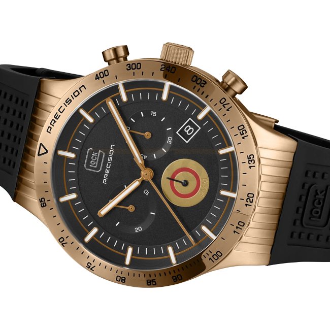 Le boîtier en acier inoxydable couleur coyote est complété par un bracelet en silicone noir avec la texture RTF de GLOCK. Le cadran noir, orné du détail distinctif de douille, affiche des aiguilles et des indices avec Swiss Super-LumiNova® pour une lisibilité améliorée, même dans des conditions d’éclairage difficiles. Alimentée par un mouvement suisse fiable, dotée d’une fonction chronographe et d’une résistance à l’eau jusqu’à 20 ATM, cette montre allie fonctionnalité et style.