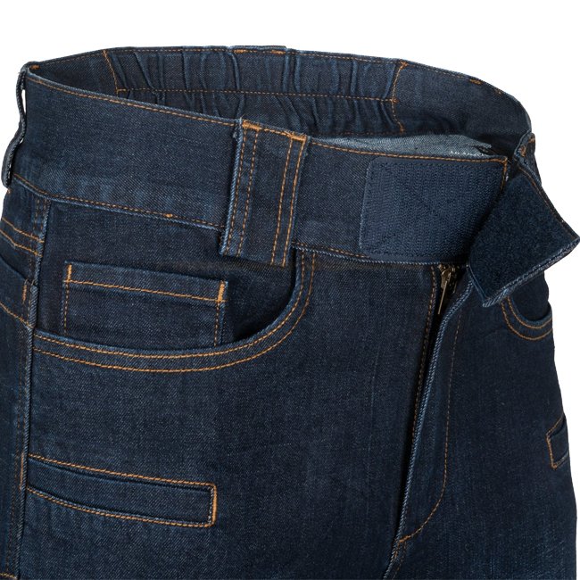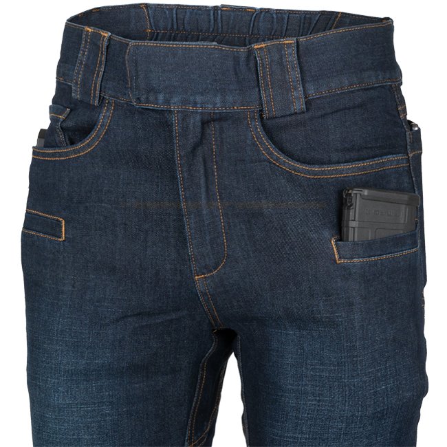Jeans tactiques slim Helikon-Tex Greyman en denim bleu foncé moyen avec 9 poches, ceinture élastique et design ajusté pour les activités dynamiques. Fabriqué en mélange de denim de 10 oz pour la durabilité. Parfait pour un usage tactique.