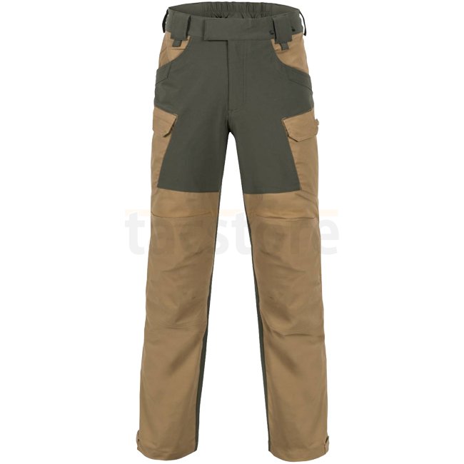 Les Hybrid Outback Pants sont confortables et durables et peuvent être partiellement imperméabilisés avec de la cire. Il y a deux poches avant classiques avec des bords renforcés pour les attaches couteau / lumière, deux poches cuisse avant fermées par une fermeture Velcro et deux poches cargo zippées.