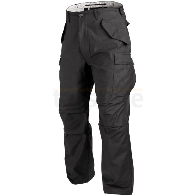 Pantalons Helikon-Tex M65 en noir, taille M longue. Mélange de coton et nylon, poids total 988g. Comprend une ceinture ajustable, plusieurs poches, une poche intérieure cachée, un genou profilé et une braguette zippée YKK.