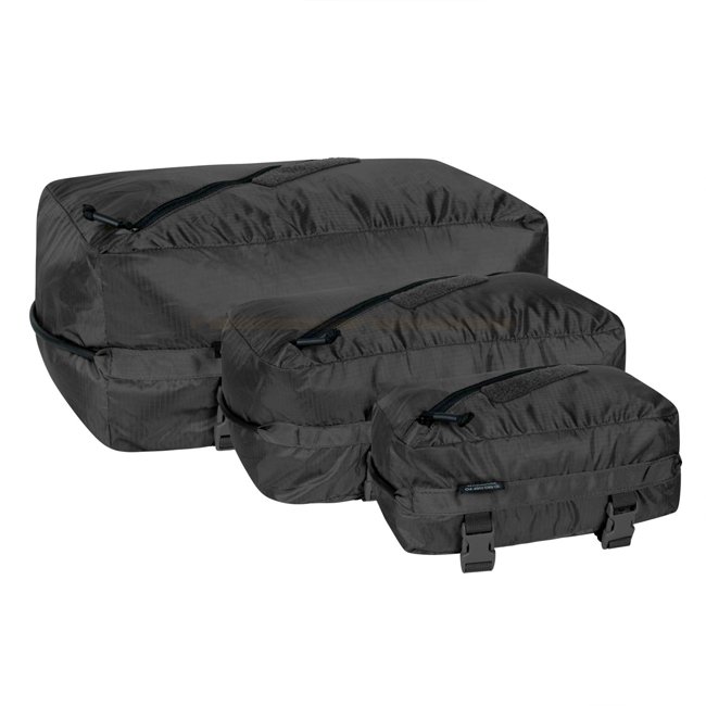Un ensemble compact et durable de sacs pliables en noir, fabriqué en matériau micro-ripstop léger avec des poignées de transport caoutchoutées et des fermetures éclair YKK. Inclut plusieurs tailles pour une utilisation polyvalente.