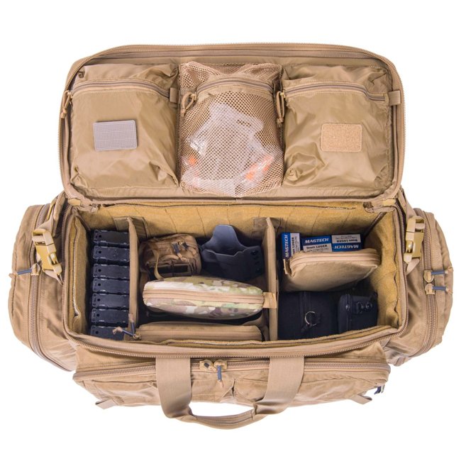 • Poches: Trois poches zippées dans le couvercle, deux poches latérales (dont une désignée Med‑Kit), une poche extérieure rabattable et des poches plates pour cibles ou matériel sale