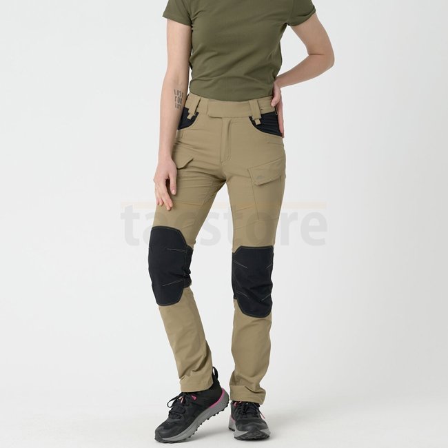 Pantalon tactique extérieur OTP pour femmes Helikon-Tex en khaki/noir, taille L. Tissu VersaStretch® avec un stretch 4 directions pour une liberté de mouvement. Revêtement DWR pour protection contre le vent et la pluie. Genoux renforcés, 8 poches, coupe a