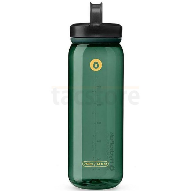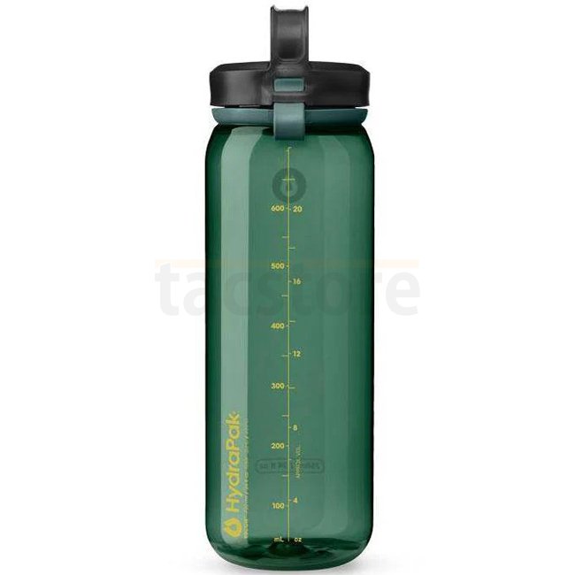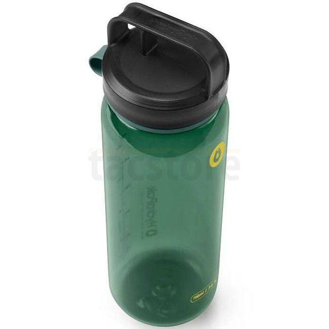 Une bouteille verte HydraPak RECON™ Clip & Carry de 750 ml, durable et légère, fabriquée à partir de 50 % de contenu recyclé. Parfaite pour les aventures en plein air avec un capuchon attaché, une poignée inclinée et un profil élancé.