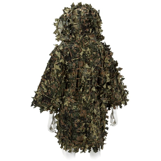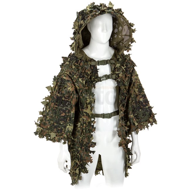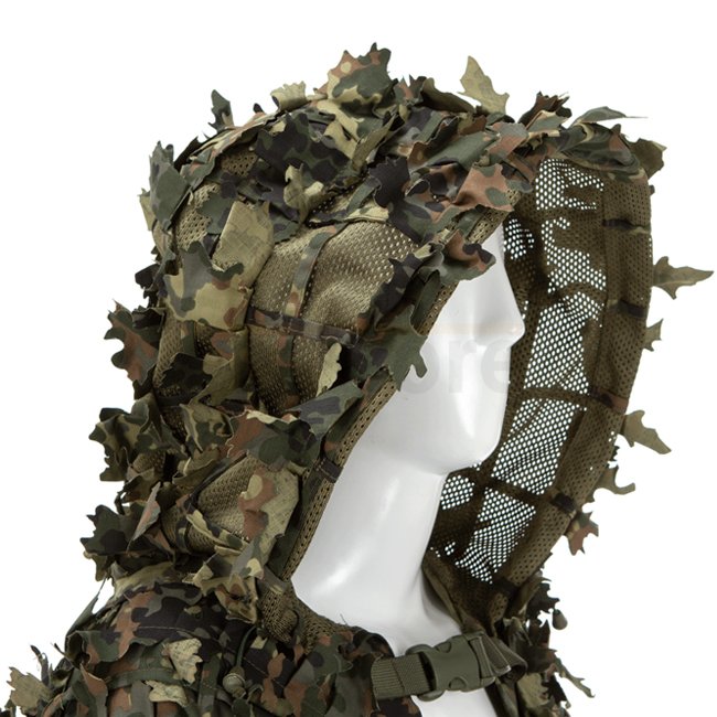 Tenue de camouflage minimaliste Invader Gear Ghillie Base Leaf - Flecktarn : costume de camouflage minimaliste; léger, ajustable, avec une capuche en maille surdimensionnée et un feuillage intégré pour un camouflage amél