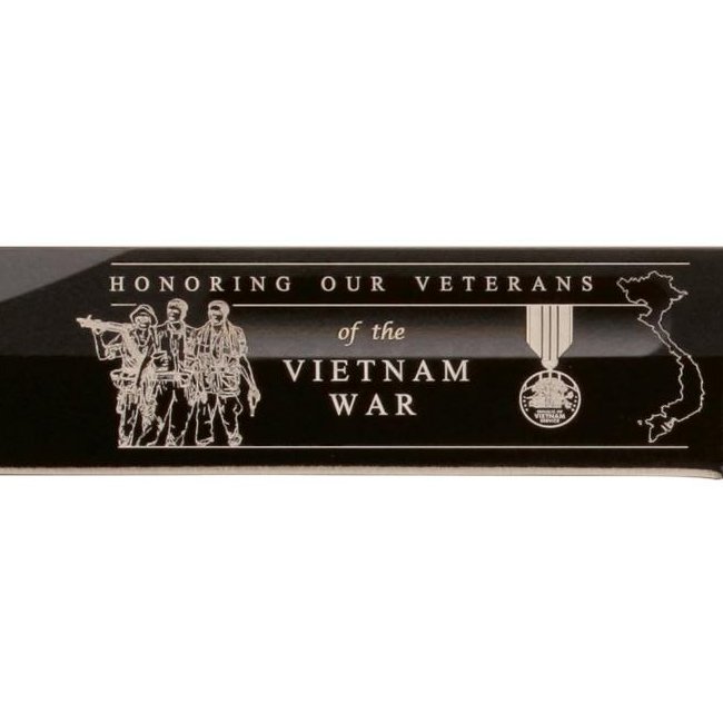 Ce couteau a été gravé au laser avec une lame soigneusement conçue pour honorer les vétérans de la guerre du Vietnam. Tang estampillé U.S. ARMY. Fourreau en cuir inclus. Fabriqué aux Etats-Unis.