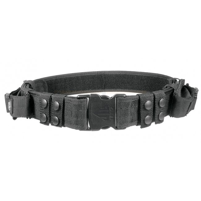 Ceinture pour les forces de l'ordre et la sécurité en noir avec du Cordura 1000D, largeur de 5cm, circonférence de 76-132cm et poids de 406g. Comprend deux pochettes horizontales pour chargeurs de pistolets et quatre passants de ceinture.