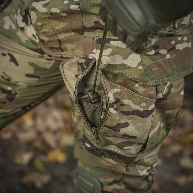 La poche cargo à rabat asymétrique est équipée d'une poche plaquée supplémentaire, qui peut contenir un chargeur M4 ou AK. La poche cargo elle-même est assez spacieuse. Il a deux plis, grâce auxquels sa taille peut être augmentée pour transporter des objets volumineux. De plus, la poche cargo est équipée d'une seconde entrée zippée, qui permet d'accéder à son contenu en position assise. Le bas des poches cargo a une maille pour une ventilation supplémentaire.