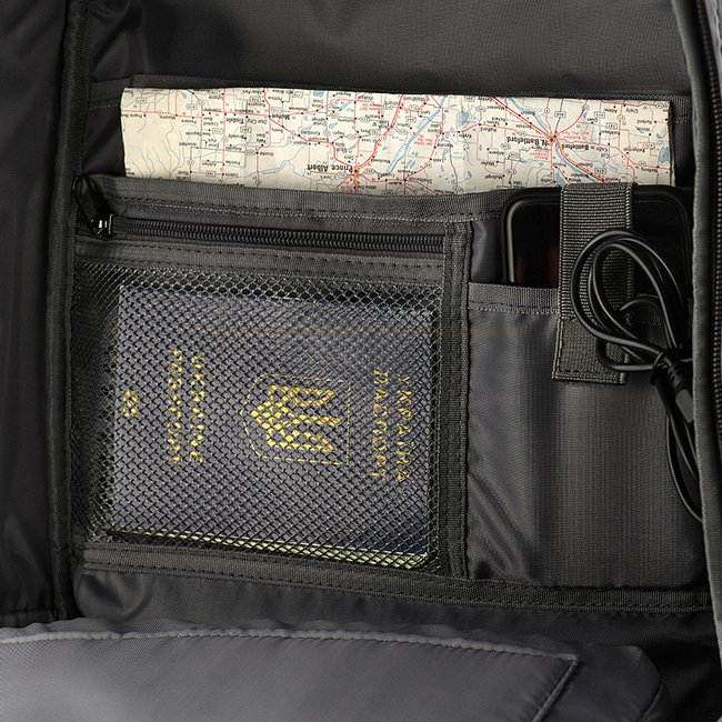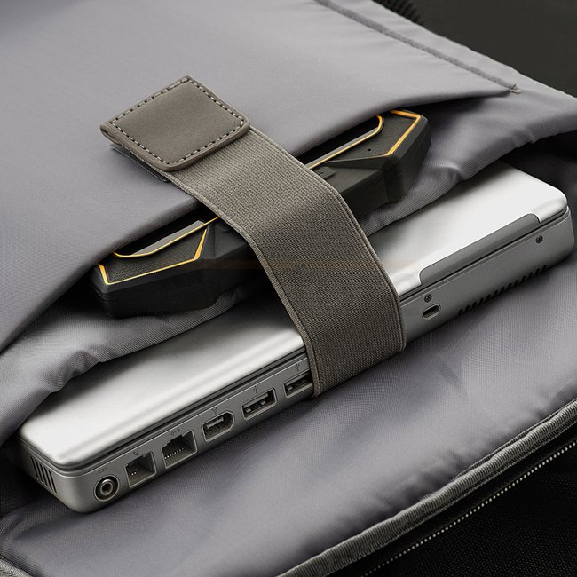 Le compartiment principal s'ouvre largement pour vous permettre de charger votre sac à dos et de sortir vos affaires facilement. À l'intérieur, il possède des compartiments protégés avec des côtés rembourrés et une bande de maintien pour un ordinateur portable et une tablette de 15 pouces, ainsi que des poches de rangement pour un téléphone portable et les accessoires associés : souris, batterie externe, adaptateur secteur, documents, stylos, câbles et pareil.