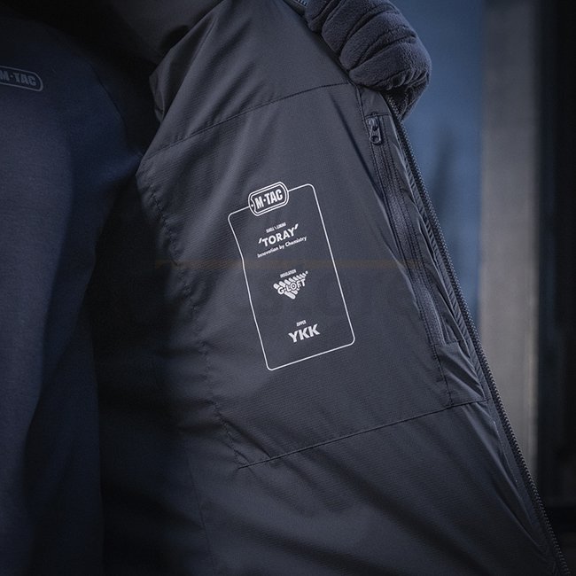 Fabriqué en tissu de nylon léger, respirant et hydrofuge de la société japonaise Toray. La veste est isolée avec une isolation autrichienne innovante G-Loft d'une densité de 100 g / m2, qui possède des qualités d'isolation thermique élevées et évapore facilement l'humidité lorsqu'elle est mouillée. De plus, cette matière allie organiquement la douceur du duvet et la résistance des fibres synthétiques.
