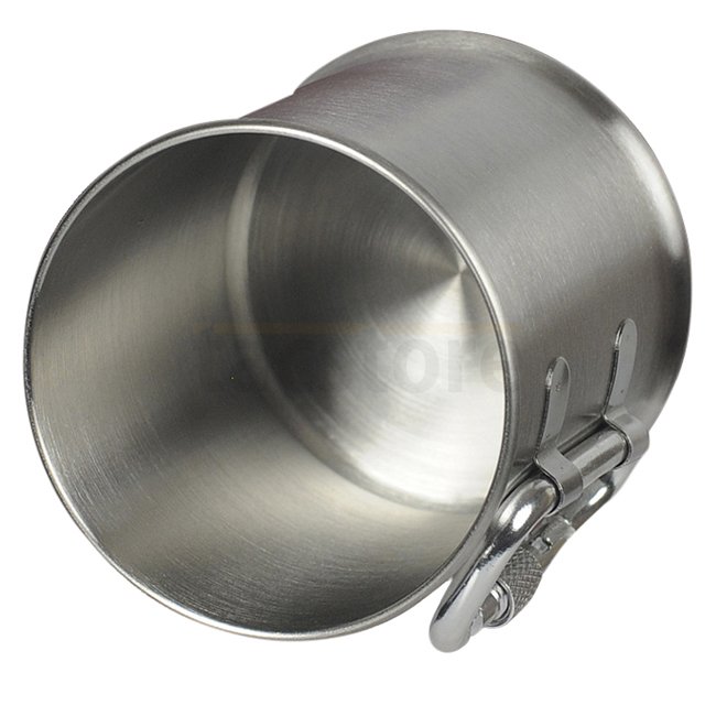 Mug en acier inoxydable avec un mousqueton et un volume de 250ml. La carabine est utilisée à la place de la poignée et se fixe à votre équipement lorsqu'il n'est pas utilisé.