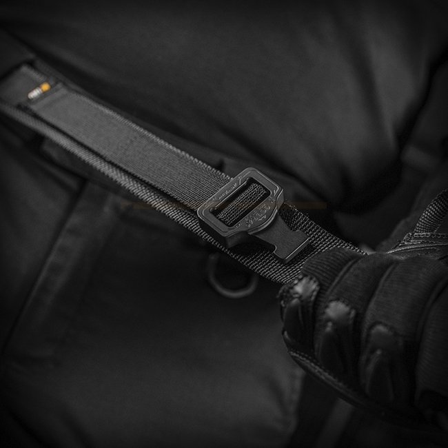 Fabriqué en sangle de nylon solide, résistant aux frottements et aux dommages mécaniques. À l'extérieur, il y a une interface MOLLE qui vous permet d'installer en toute sécurité des équipements supplémentaires. La ceinture est fixée avec une boucle spéciale Cobra 25 mm du fabricant autrichien AustriAlpin, qui peut résister aux charges les plus extrêmes. Il se ferme rapidement et se détache facilement en appuyant simultanément sur les loquets latéraux.